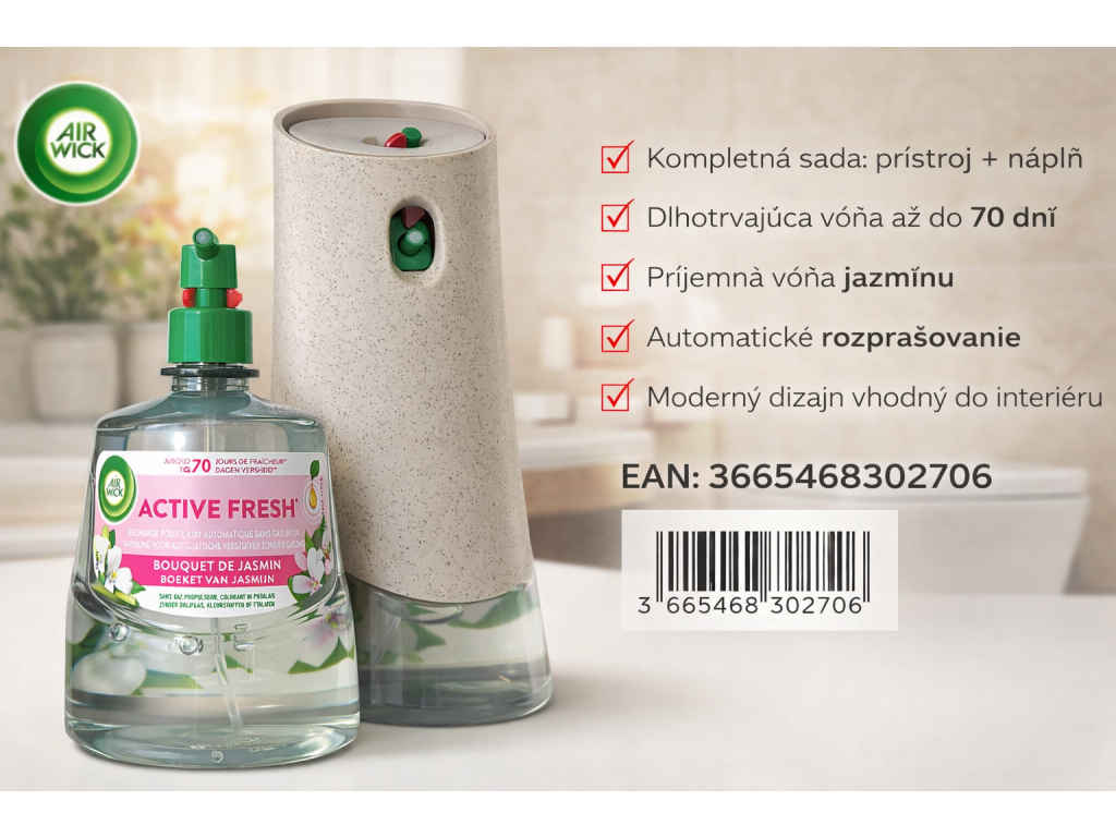Air Wick Active Fresh – automatický osviežovač vzduchu + náplň (Jasmín) 228ml