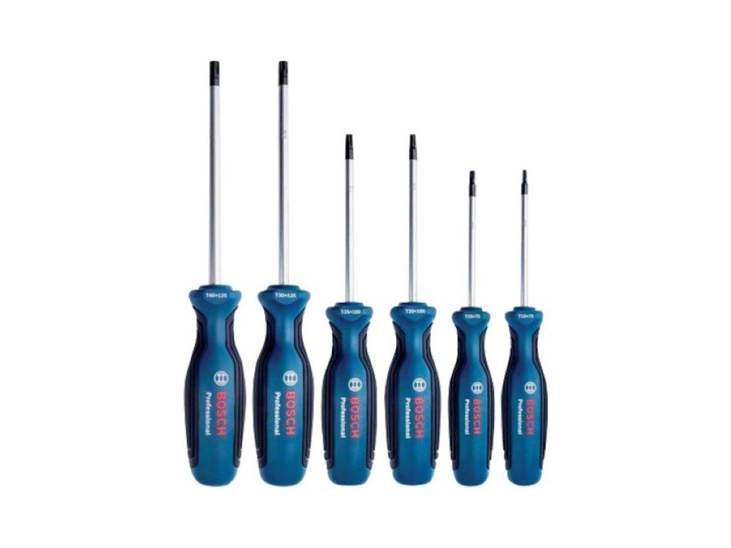 Bosch kombinovaná šesťdielna sada skrutkovačov TX 1600A01V09 je praktický set nástrojov navrhnutý pre presné a pohodlné uťahovanie a povoľovanie šróbov s TX (Torx) hlavami. Sada obsahuje 6 rôznych veľkostí šróboviek, takže pokrýva bežné použiťia pri opravách, montážach či domácich projektoch.