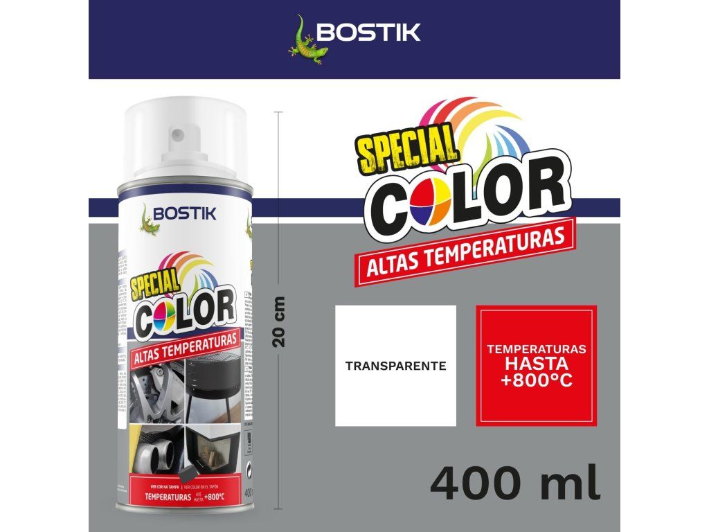 - Bostik Special Color Altas Temperaturas je farba v spreji, ktorá odoláva teplotám až do 650 °C (špičkové hodnoty 800 °C);