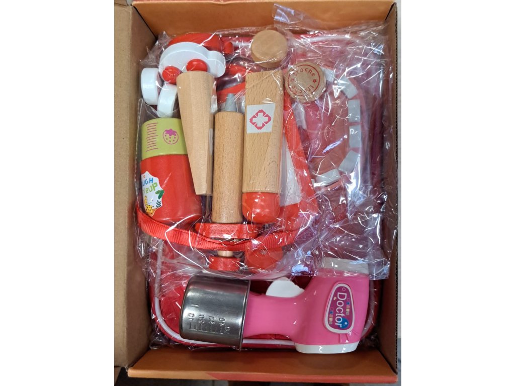- Obsahuje skutočný stetoskop, lekársky plášť a čiapku, tácku, nerezový pohár na jód, drevenú injekčnú striekačku, pinzetu, kapsuly, bavlnu, okuliare, teplomer, umývateľný poťah na tvár, obväz a rôzne realistické doplnky na starostlivosť o zuby na čistenie a ošetrenie.