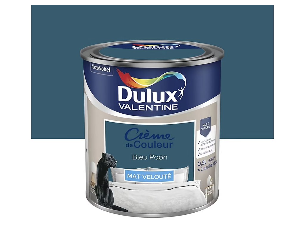 Dulux Valentine Crème de Couleur v odtieni Bleu Paon je elegantná matná farba, ktorá dodá interiéru moderný a sofistikovaný charakter.