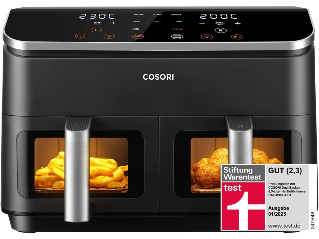 Fritéza na horúci vzduch COSORI 6 v 1 s 2 komorami je prémiový kuchynský spotrebič navrhnutý pre zdravé, pohodlné a rýchle varenie. S celkovým objemom 8,5 l a dvojitou komorou umožňuje pripravovať dve rôzne jedlá súčasne bez miešania chutí. Každá komora má svoje vlastné ovládanie, takže môžete nastaviť čas a teplotu podľa potreby. Vďaka okienku v komore môžete kontrolovať proces varenia bez prerušenia. Tento model získal ocenenie víťaza testu Stiftung Warentest za kvalitu a funkčnosť. Elegantné prevedenie v svetlo striebornej farbe kombinuje štýl s praktickosťou a modernými funkciami.