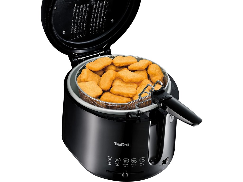 Fritéza je vybavená praktickým vekom s priezorom, ktorý umožňuje sledovať proces vyprážania bez nutnosti otvárania, čím sa minimalizujú tepelné straty a rozstrek oleja. Odnímateľná nádoba na olej a fritovací kôš výrazne uľahčujú čistenie a údržbu po použití. Stabilná konštrukcia a tepelne izolované časti zvyšujú bezpečnosť pri manipulácii, zatiaľ čo kompaktný tvar umožňuje jednoduché skladovanie aj v menších kuchyniach. Tefal Maxi Fry je vhodná pre domácnosti, ktoré uprednostňujú klasické vyprážanie s dôrazom na jednoduchosť, spoľahlivosť a konzistentné výsledky. Tento model ponúka vyvážený pomer medzi kapacitou, výkonom a komfortom používania, čím sa stáva praktickým riešením pre každodenné varenie aj víkendové rodinné obedy.