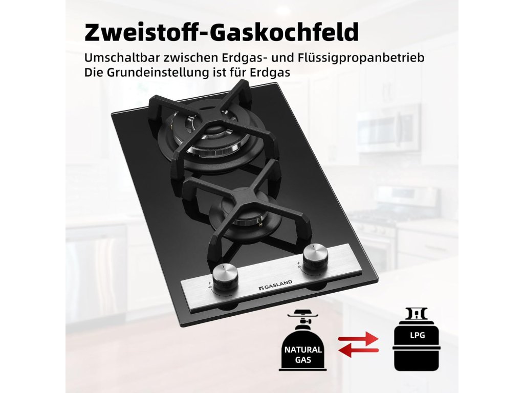 GASLAND GH30BF je navrhnutý s univerzálnou kompatibilitou s plynom – štandardne pre zemný plyn (Natural Gas) a možnosťou konverzie na propán-bután (LPG) pomocou dodaného konverzného kitu, takže si ju môžete prispôsobiť podľa zásob plynu vo vašej domácnosti.