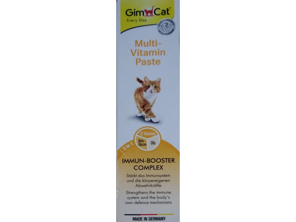 GimCat je multivitamínová pasta s obsahom 3 v 1 komplexu z 12 vitamínov pre mačky. Obsahuje 12 základných vitamínov, beta-glukán a vysoko kvalitné organické oleje, ktoré spolupracujú na posilnení imunitného systému a aktivácii vlastnej obranyschopnosti tela.