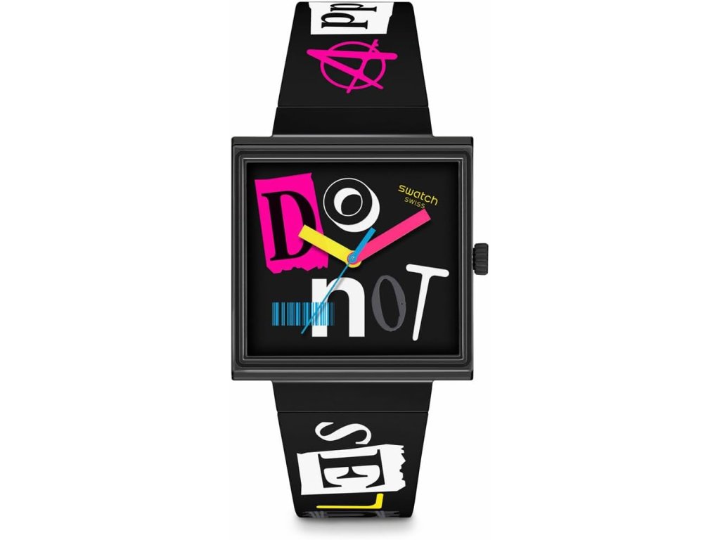 Swatch No Rules Pierced Edge SO34B100 sú originálne unisex analógové hodinky, ktoré predstavujú odvážnu kombináciu moderného dizajnu a individuálneho štýlu. Hodinky sú súčasťou kolekcie No Rules – teda série, ktorá stavia na kreatívnom prejave a rebélii voči bežným módnym normám, a to sa odzrkadľuje v ich vizuále aj pocite nosenia. Ich hranatý ciferník s výraznou minimalistickou grafikou vytvára kontrast s farebnými ručičkami a heslom „Rules do not apply“, ktoré sa objavuje na ciferníku aj na remienku, čo z hodiniek robí výrazný módny doplnok pre tých, ktorí chcú odlíšiť svoj štýl od ostatných.