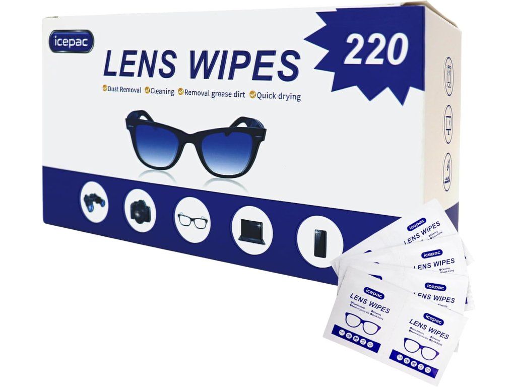 Icepac utierky na okuliare – 220 predvlhčených utierok na čistenie okuliarov v samostatných obaloch | Čistič okuliarov bezpečne čistí okuliare, slnečné okuliare, displeje telefónov, elektroniku a objektívy fotoaparátov.
