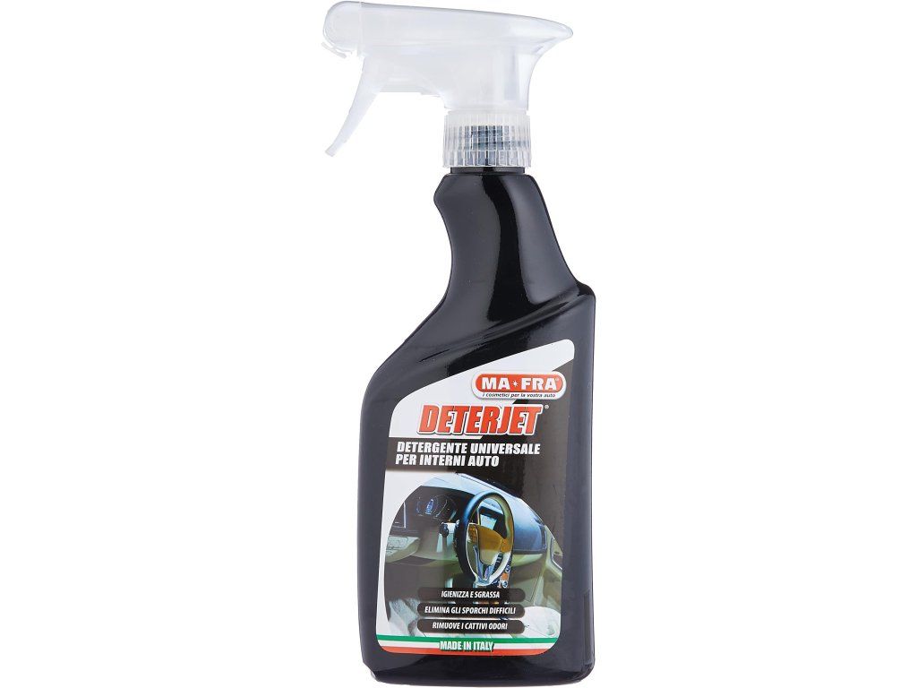 Mafra Univerzálny čistiaci prostriedok DETERJET je čistiaci prostriedok na interiér automobilov. Odmasťuje a dôkladne čistí všetky umývateľné povrchy automobilu. Ideálny na renováciu a oživenie interiéru automobilu, odstránenie stôp po domácich zvieratách alebo nepríjemných zápachov, ako je napríklad zápach cigaretového dymu. Účinný proti odolným nečistotám alebo ťažko odstrániteľným škvrnám, ako sú škvrny od nápojov, zmrzliny a všetky druhy mastnoty.