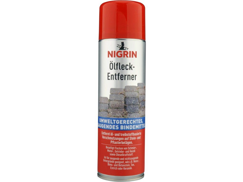 NIGRIN odstraňovač olejových škvŕn je ekologický absorpčný viazač na odstraňovanie znečistenia na báze oleja a paliva z kamenných a dlažbových povrchov, napr. parkovísk, vjazdov, garáží a dielní. Je vhodný na absorpčné aj neabsorpčné podklady, ako napr. prírodný kameň, pemza a betón, hlina, poter a keramika.