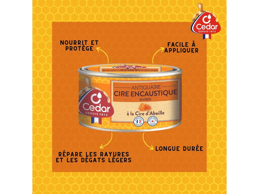 NAŠA PASTA ENCAUSTIC WAX: Jej zloženie na báze včelieho vosku a terpentínovej esencie vám umožňuje vyživovať, leštiť a chrániť voskované drevo. Textúra pasty zabraňuje stekaniu pri nanášaní, vďaka čomu je ideálna na nábytok.