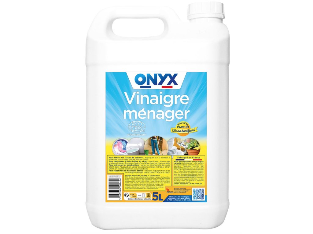 Onyx Vinaigre Ménager Parfumé je ekologický a viacúčelový čistiaci prostriedok s príjemnou citrónovou vôňou, ktorý účinne odstraňuje usadeniny vodného kameňa a leskne povrchy.
