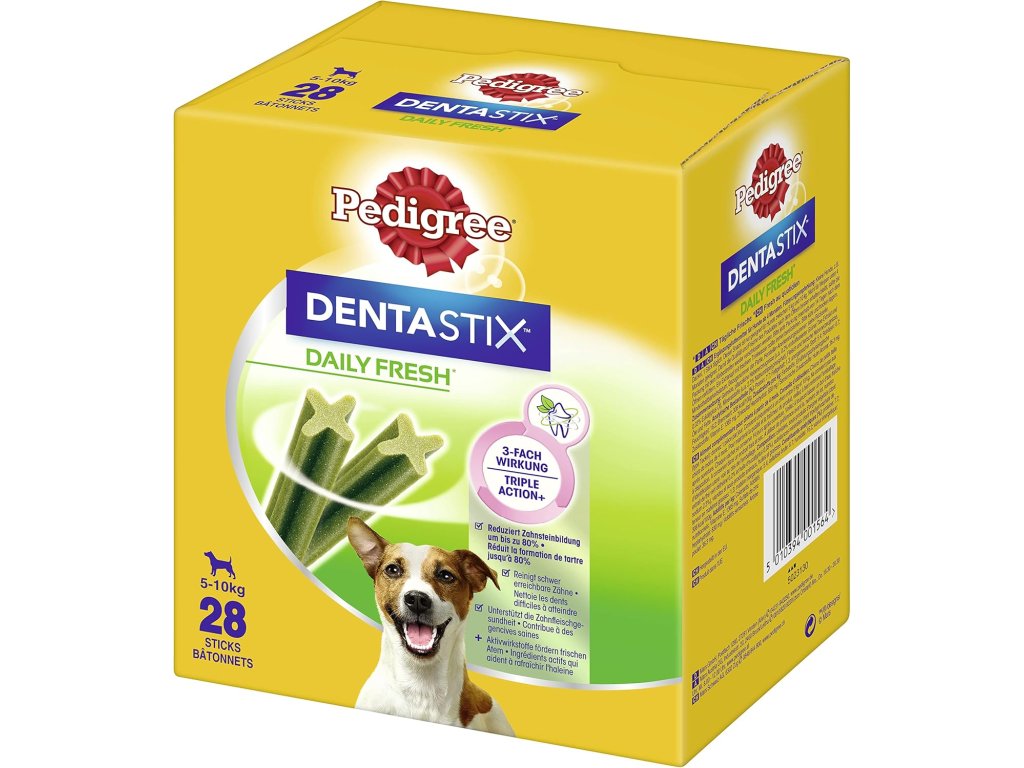 Pedigree Dentastix Fresh (28 tyčiniek) 4 × 110 g (veľkosť pre malých psov) je dentálna pochúťka určená pre malé plemená psov, ktorá pomáha znižovať zubný kameň a podporuje zdravé ďasná. Tyčinky majú jedinečný X tvar a špeciálnu textúru, ktorá mechanicky čistí zuby počas žuvania. Obsahujú prírodné výťažky zo zeleného čaju a eukalyptu, ktoré zabezpečujú svieži dych. Sú bez pridania cukru a umelých prísad, s nízkym obsahom tuku. Ideálne na každodenné použitie, podporujú zdravie ústnej dutiny a zároveň uspokoja prirodzenú potrebu žuvania malých psov.