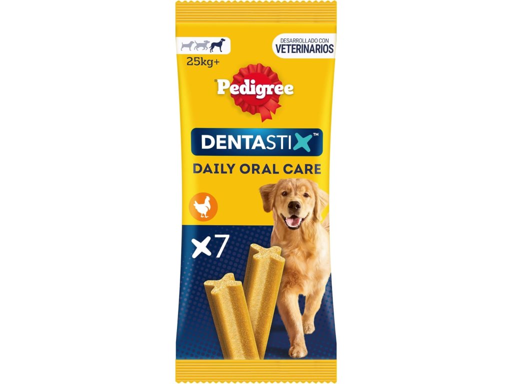 Pedigree Dentastix ústna hygiena pre veľké psy – 7 ks, 270 g (kuracie) sú dentálne tyčinky určené pre veľké plemená psov s váhou nad 25 kg. Pomáhajú redukovať tvorbu zubného kameňa až o 80 % a podporujú zdravie ďasien. Tyčinky majú jedinečný tvar a textúru, ktorá mechanicky čistí ťažko dostupné miesta v ústach počas žuvania. Obsahujú prírodné výťažky zo zeleného čaju a eukalyptového oleja, ktoré zabezpečujú svieži dych. Sú bez pridania cukru a umelých farbív, s nízkym obsahom tuku. Odporúča sa podávať jednu tyčinku denne.