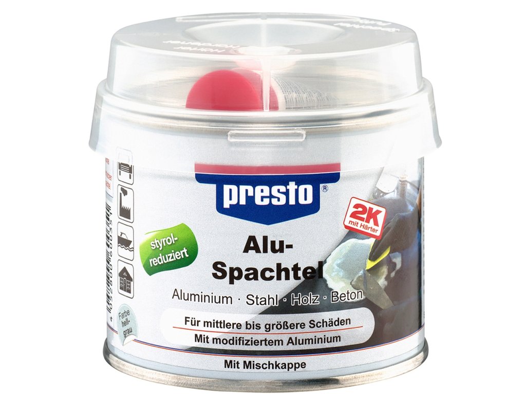 Presto Alu-Spachtel je vysoko kvalitný dvojzložkový tmel určený na opravy a vyrovnávanie povrchov z hliníka a dreva.