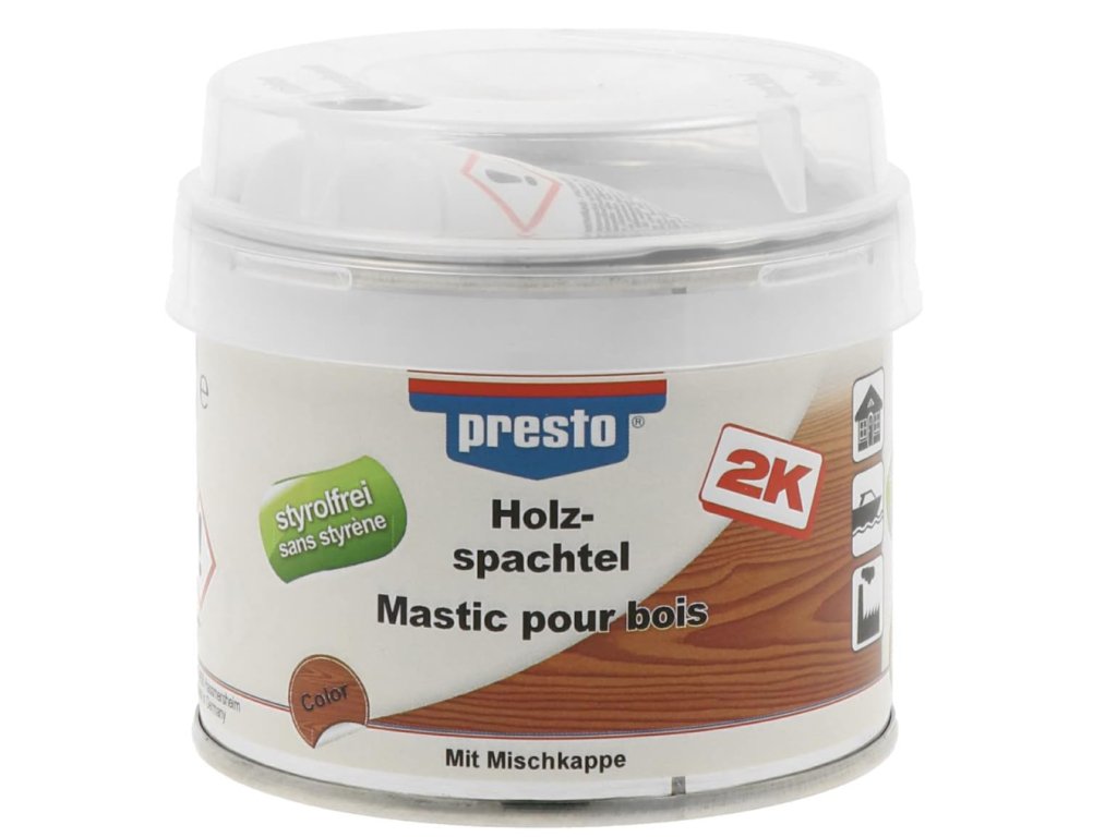 Presto Wood Putty v tmavohnedej farbe je ideálny na opravy drevených povrchov, ako sú nábytok, podlahy alebo dvere. Tento 2K tmel je bez styrénu, čo zaručuje šetrnosť k životnému prostrediu a minimalizuje zápach pri použití. Vďaka svojej vysokej elasticite a vynikajúcej priľnavosti sa ľahko nanáša a vyhladzuje, čím vytvára pevný a odolný povrch. Tmel je odolný proti slabým kyselinám, zásadám, rozpúšťadlám a vode, čo z neho robí ideálny prostriedok na dlhodobú ochranu drevených povrchov pred poškodením. Vhodný na úpravy dreva v interiéroch aj exteriéroch.