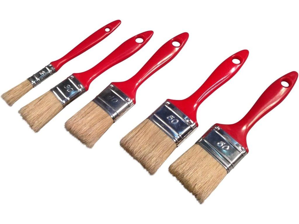 Sada 5 plochých štetcov na všetky typy farieb – červená obsahuje päť štetcov rôznych šírok určených pre použitie s latexovými, akrylovými, olejovými aj inými bežnými typmi farieb. Štetce sú vybavené pevnými, hustými štetinami, ktoré zabezpečujú rovnomerné nanášanie farby bez šmúh a zachytávajú viac farby pre efektívnu prácu.