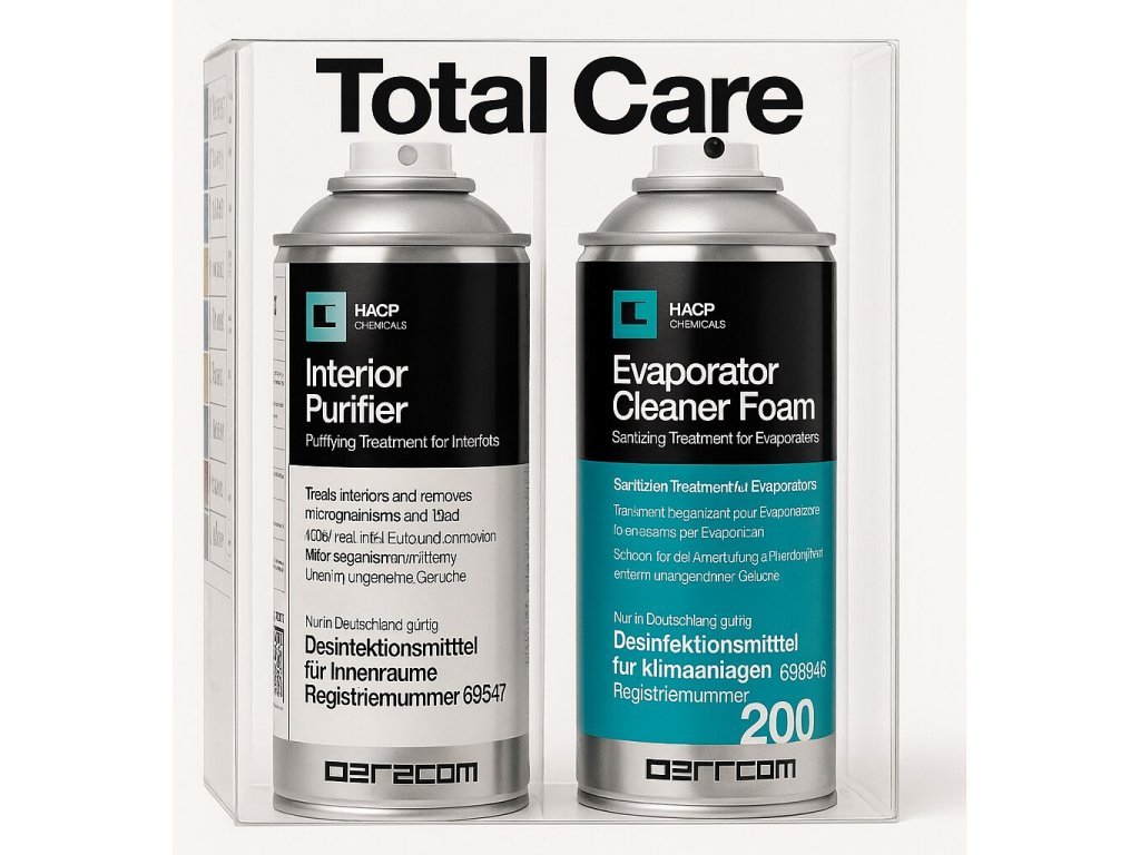 Total Care ERRECOM je profesionálna sada určená na komplexné čistenie a dezinfekciu klimatizačných systémov v domácnostiach, kanceláriách aj automobiloch. Obsahuje dva spreje po 200 ml – jeden určený na čistenie výparníka a druhý na čistenie vzduchových kanálov.