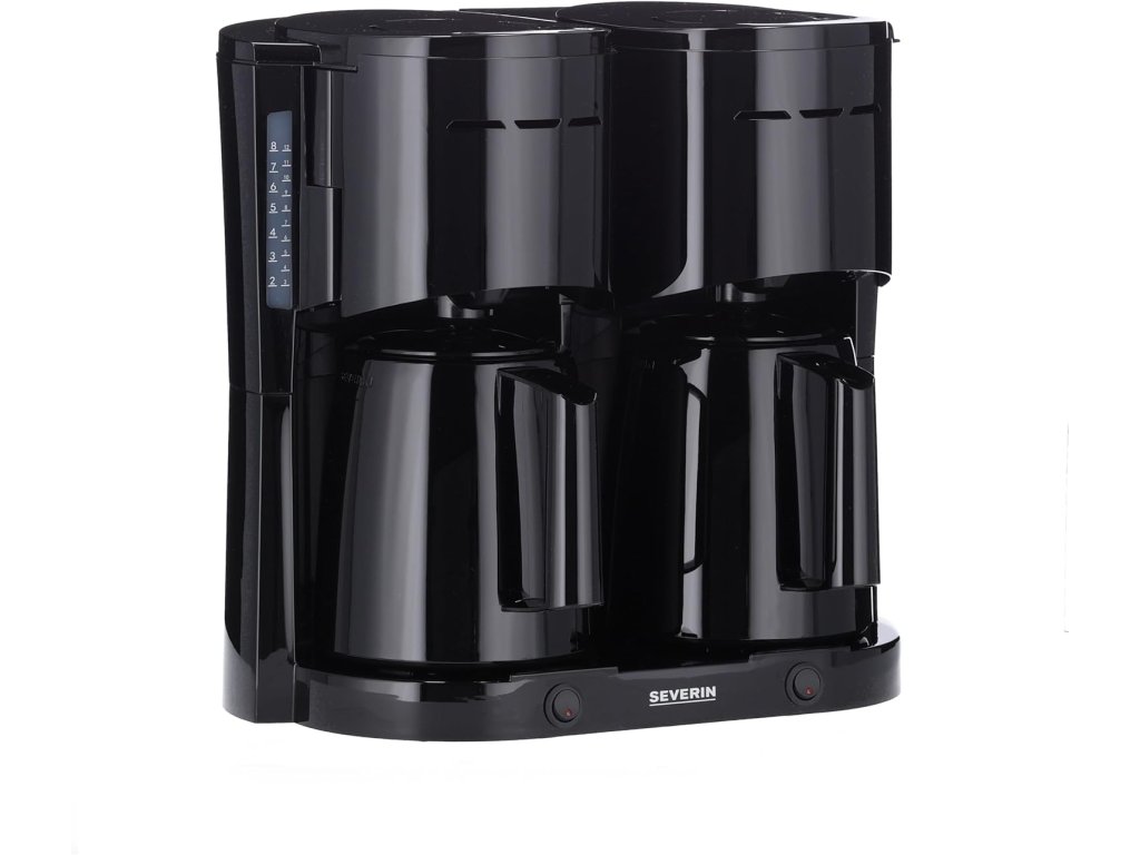 SEVERIN KA 9315 je dvojitý kávovar s dvoma termoskami, ktorý pripraví až 16 šálok kávy, udrží ju dlho teplú a zaujme elegantným dizajnom pre domáce aj kancelárske použitie.