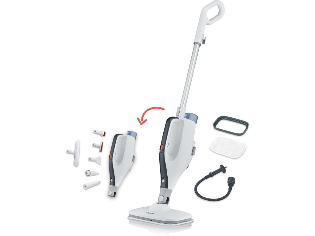 SEVERIN SC 7145 je 2 v 1 parný čistič s rýchlym nahrievaním, odstraňuje 99,9 % baktérií, má bohaté príslušenstvo a 9 m kábel pre pohodlné, ekologické čistenie.